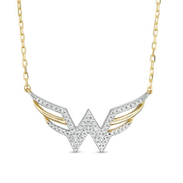 Crafted in warm 10K gold, this look showcases diamond-lined ribbons sculpted into the classic “WW” logo at the center. Polished ribbons complete the triple-row wing design. Radiant with 1/8 ct. t.w. of diamonds and a brilliant buffed luster, this symbol suspends centered along an 18.0-inch cable chain, with an additional closure ring at 16.0 inches, that secures with a spring-ring clasp. This exclusive fine jewelry collection inspires you to wear your strength, confidence and power.