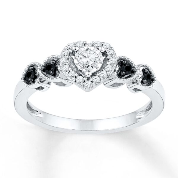 Vivacious round white diamonds form a heart in this romantic promise ring for her. Additional hearts are sprinkled with round white diamonds and black diamonds to complete the look. With a total diamond weight of 1/5 carat, the ring is styled in sterling silver. Black diamonds are treated to permanently create the intense black color.