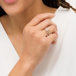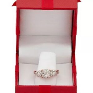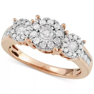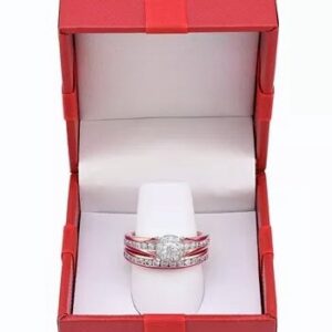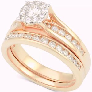 This fabulous bridal set for her features a round diamond enveloped in swirls of additional round diamonds at the center of the engagement ring. More round diamonds edge the 10K white gold band of the engagement ring and the matching wedding band. The bridal set has a total diamond weight of 3/4 carat.