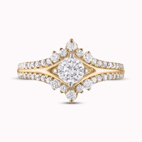 A stunning 1/2-carat round diamond sparkles at the center of this exquisite engagement ring. Set in timeless 14K yellow gold, the band is lined with two rows of brilliant round diamonds. The ring has a total diamond weight of 1 carat.