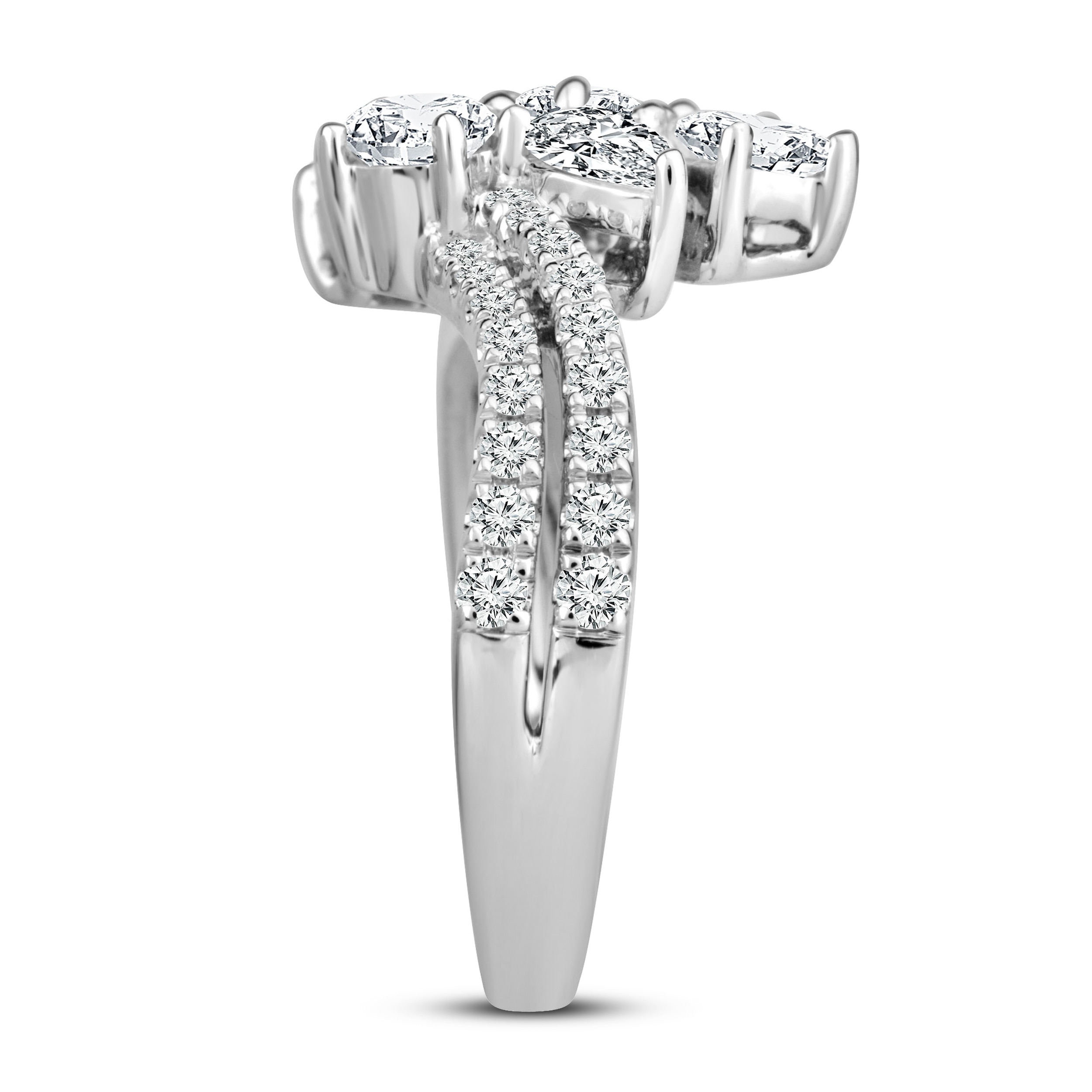 This enchanting diamond ring collection features five distinctively-shaped diamonds, symbolic of everything she means to you. Each diamond shape has a different meaning, from integrity and wisdom, to confidence, totality, and elegance. The beautiful 10K white gold ring features an oval-cut, emerald-cut, pear-shaped, round-cut, and princess-cut diamond at the center, while ribbons of brilliant round-cut diamonds flow outward. The gorgeous ring has a total diamond weight of 2 carats.