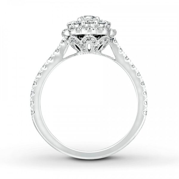 This breathtaking engagement ring? features a shimmering round diamond haloed by smaller round diamonds as the floral-inspired focal point. Additional diamonds grace the 14K white gold band, bringing the total diamond weight to 1 carat.