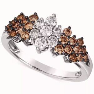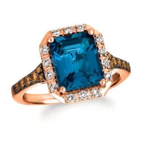 Ringfeaturing31/2cts.DeepSeaBlueTopaz,1/5cts.ChocolateDiamonds,1/5cts.NudeDiamondssetin14KStrawberryGold