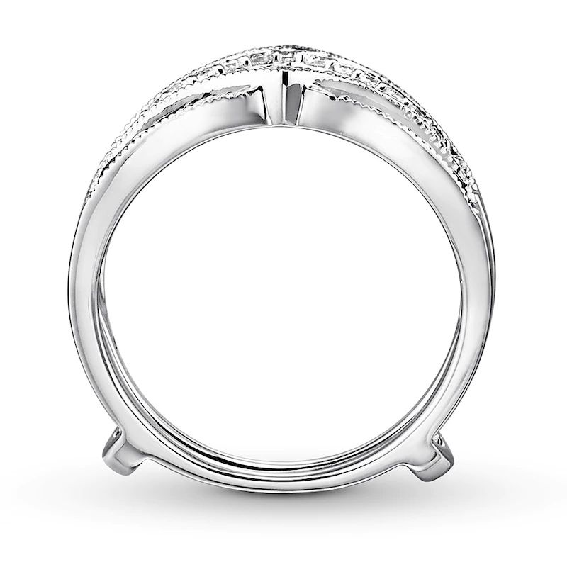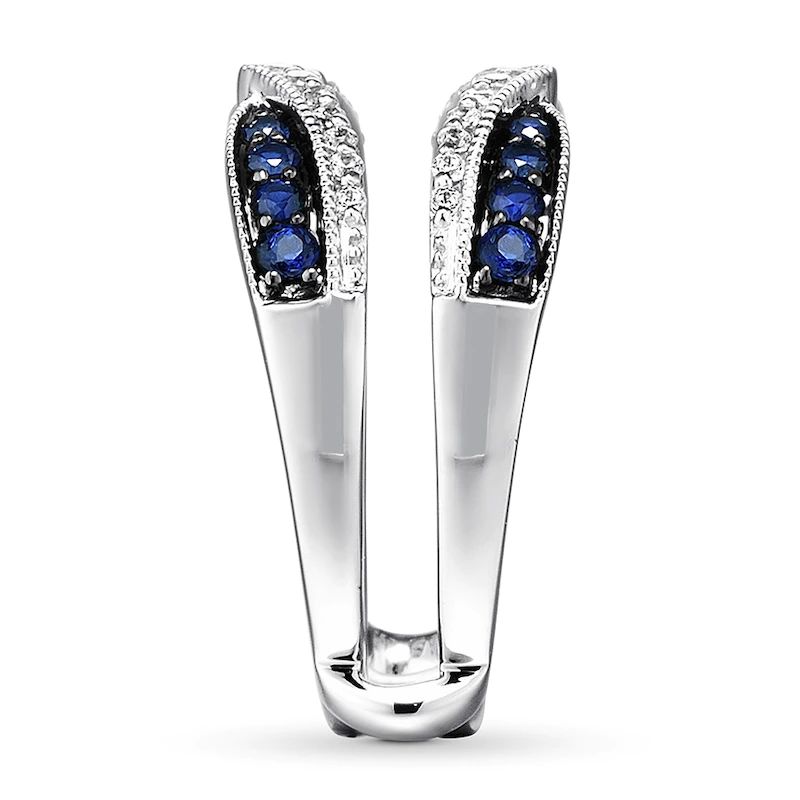 Designed to add brilliance and color to your diamond solitaire ring (sold separately), this enhancer ring features sparkling round diamonds lining chevrons above and below the center. Natural sapphires outlined in milgrain detailing define the edges to complete the look. Crafted of 14K white gold, the ring has a total diamond weight of 1/5 carat.